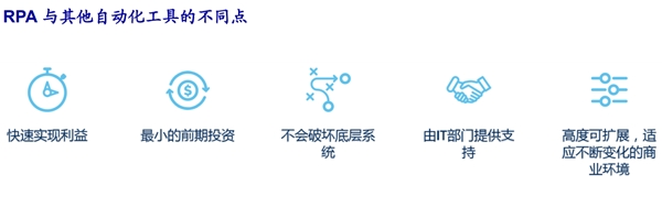 工业机器人由来已久,RPA相对于传统代替人类手工劳动的机器人,主要用于在信息系统的自动化操作,具备自动执行预定流程和跨系统协同的能力。相较于其他IT解决方案,RPA可以利用现有的基础设施来实施,而不会破坏底层系统。对于使用者来说,RPA可以RPA允许组织将之前成本和时间的一小部分进行自动化,在替换成本、盈利时间、可扩展性上都具有优势。